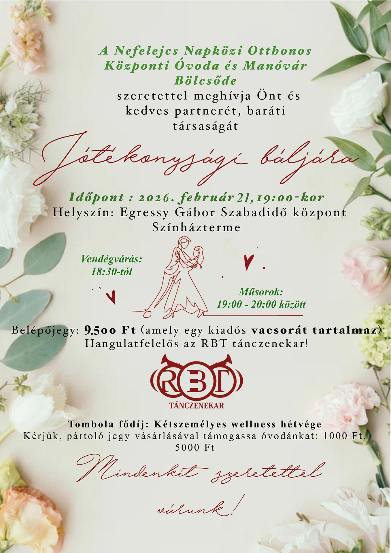 A Nefelejcs Napközi Otthonos Központi Óvoda és Manóvár Bölcsőde szeretettel meghívja Önt és kedves partnerét, baráti társaságát Jótékonysági báljába.